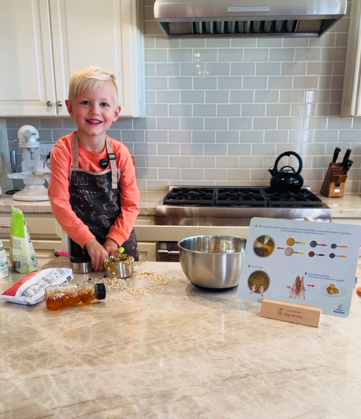 Little Bites, Big Minds snack recipe cards are thoughtfully designed with picture cues so pre-readers can follow along. By inviting your little one into the kitchen, you're serving up way more than just snacks. You're dishing out independence, building fine motor skills, boosting sensory development, expanding their palate, talking about nutrition, and even sprinkling in early math and language skills. Measuring, mixing, tasting - its's all learning, disguised as fun!